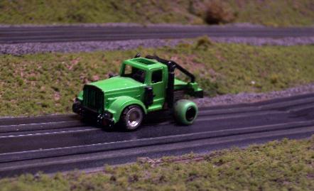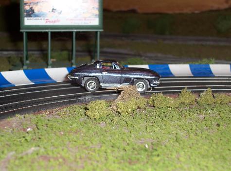 | Bedford Glens is a windy two-lane road course. She's flanked by long straights that lead into gentle 15" radii turns. The infield took months to finally settle on. It has a combination of 6" hairpins, 9" standard turns with Aurora Speed Corners, a nice parabolic turn and a few short straights with chicanes. The course requires cars with good top end for the two long straights, but still requires cars & drivers with good cornering to handle the technical infield. Being a permanent track (that I may finish landscaping someday...) much time, thought and testing went into the design so it would always remain a challenging course to drive on. |