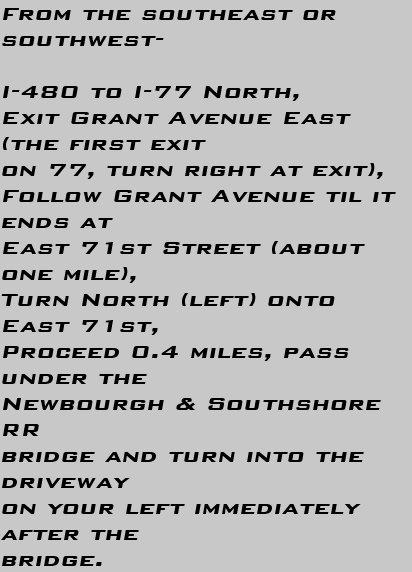 | From the Northwest- Rt 2 or I-90 East to I-77 South, From the Northeast- I-90 West to I-77 South, Exit Grant Avenue East (the exit after Harvard Ave., turn left at exit), Follow Grant Avenue til it ends at East 71st Street (about one mile), Turn North (left) onto East 71st, Proceed 0.4 miles, pass under the Newburgh & South Shore Railroad bridge and turn into the driveway on your left immediately after the bridge. |