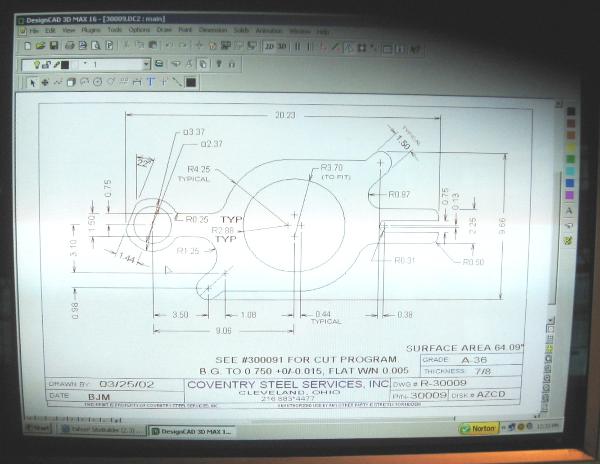 | All programs for shape cut parts are drawn on computer. This helps insure our customers' requirements for tight tolerances and repeatability. |